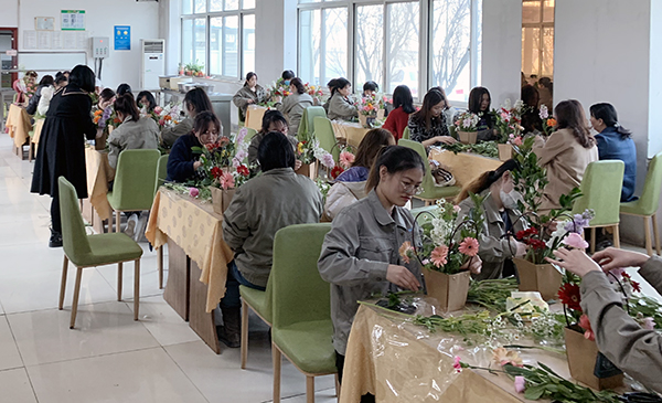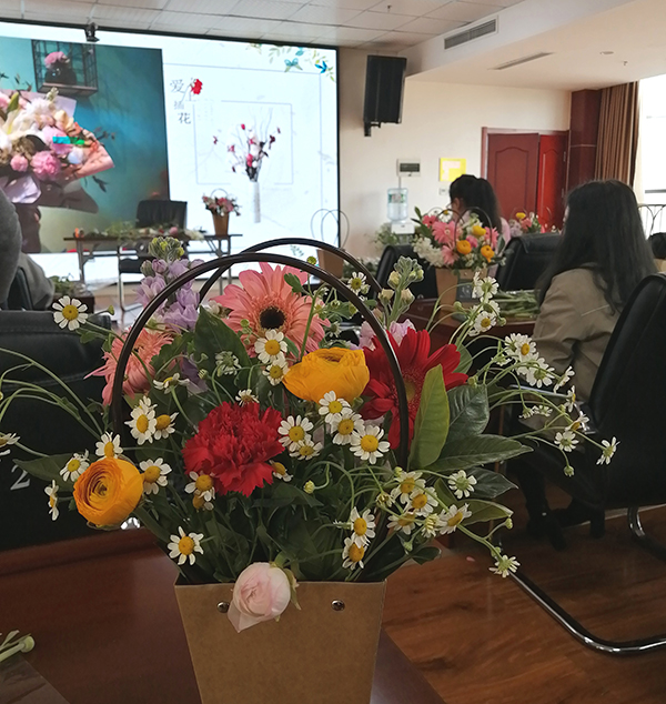 活动特邀花艺讲师进行讲解示范,在介绍了插花的造型要素和技巧手法后,讲师通过现场演示,指导大家制作出一簇簇精美的花艺作品。一支支黄玫瑰、紫罗兰、洋甘菊......经过女同胞们的巧手修剪、色彩搭配,构思细致地置入花篮,变的错落有致、赏心悦目,也寄托了大家对美的理解和对幸福的感悟。